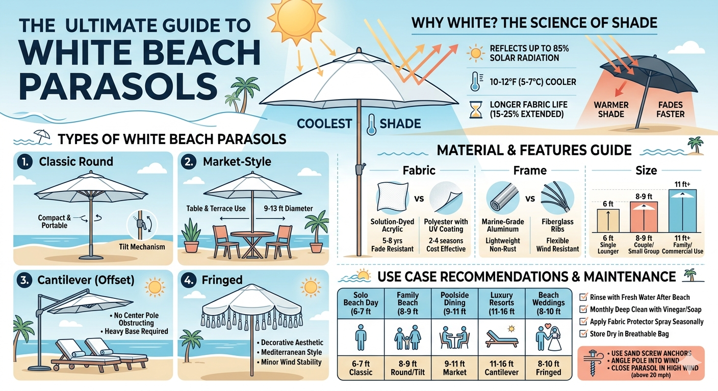 Typy bílých plážových slunečníků: Jaký styl vyhovuje vašim potřebám?